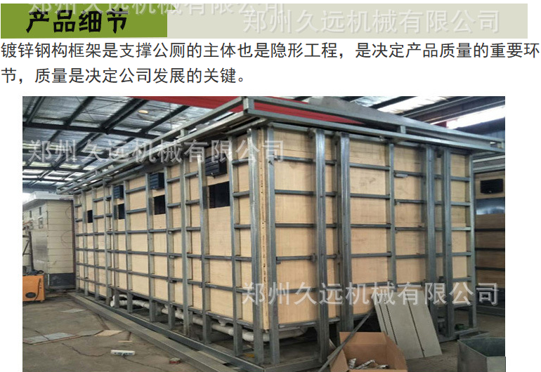 1、房體結(jié)構(gòu): 采用輕鋼龍骨結(jié)構(gòu),鋼材全部使用國家標(biāo)準(zhǔn)鍍鋅鋼材。根據(jù)房體的大小特選用國標(biāo)方管(50-100)焊接而成。鍍鋅管厚度為2.8mm,方管經(jīng)過除銹后進(jìn)行鍍鋅、防腐處理。這樣就會(huì)延長廁所使用壽命。